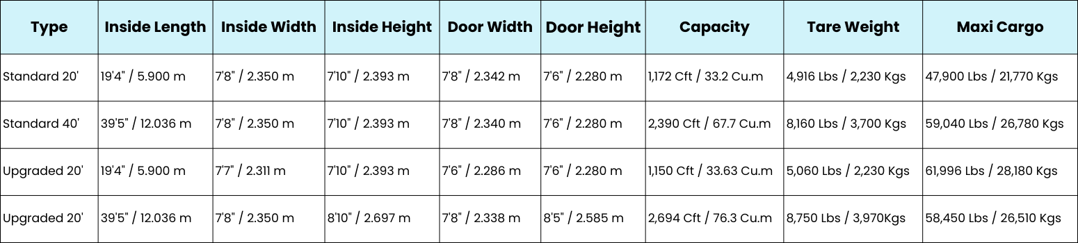 Standard 40' | 39'5" / 12.036 m | 7'8" / 2.350 m | 7'10" / 2.393 m | 7'8" / 2.340 m | 7'6" / 2.280 m | 2,390 Cft / 67.7 Cu.m | 8,160 Lbs / 3,700 Kgs | 59,040 Lbs / 26,780 Kgs |